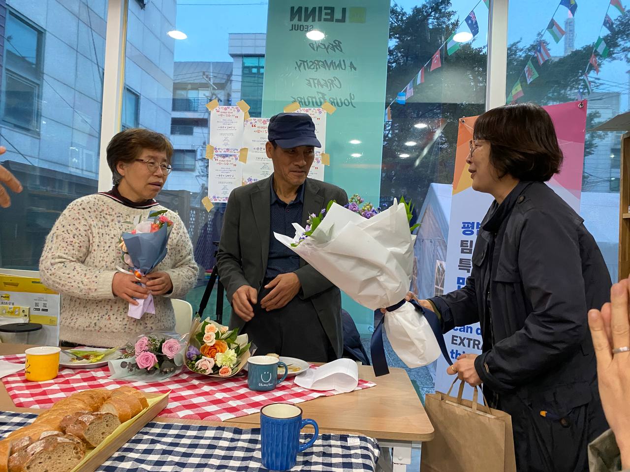 본격적인 식사 전, 감사와 응원을 전하고자 예쁜 꽃다발과 선물을 전해드리는 시간을 가졌습니다. 두 분이 너무 좋아하셔서 지켜보는 이들까지 행복해지는 시간이었습니다. 선물 증정식 후 맛있는 음식을 먹으며 이야기를 나누는 시간을 가졌습니다. 자리에 참석해주신 많은 분들이 즐겁게 이야기꽃을 피우느라 다들 늦은시간까지 함께해주셨습니다.