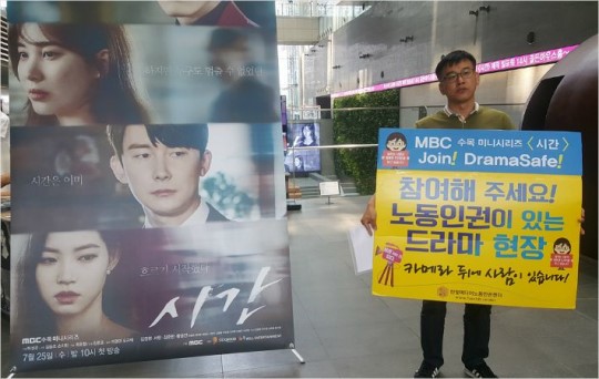 20일 오후 MBC 새 수목드라마 '시간' 제작발표회로 북적이는 서울시 상암동 MBC 신사옥 로비에 한 남자가 알록달록한 피켓을 들고 홀로 서 있었다. 피켓에는 'MBC 수목 미니시리즈 <시간> 참여해 주세요! 노동인권이 있는 드라마 현장'이라는 문구가 보였다.