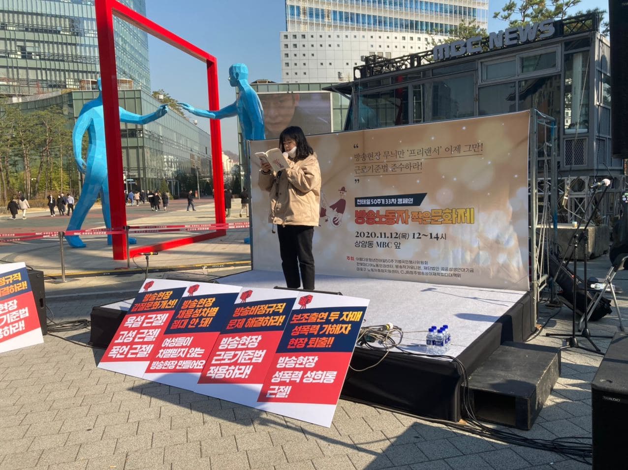 오늘 발언을 함께 해주신 방송작가유니온의 김한별 부지부장과 대구MBC 비정규직다온분회의 조합원, 그리고 2009년 보조출연 관리자 집단 성폭력 사건으로 소중한 가족을 떠나보낸 뒤 10년 넘게 투쟁을 지속 중인 장연록 어머님은 故 조영래 변호사의 <전태일 평전>의 부분을 함께 낭독하며, 2020년 현재도 방송-미디어 현장에서 벌어지는 고된 노동의 현실을 말씀해주셨습니다.
