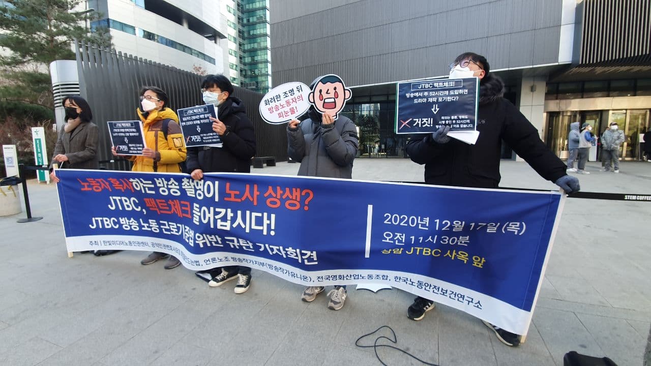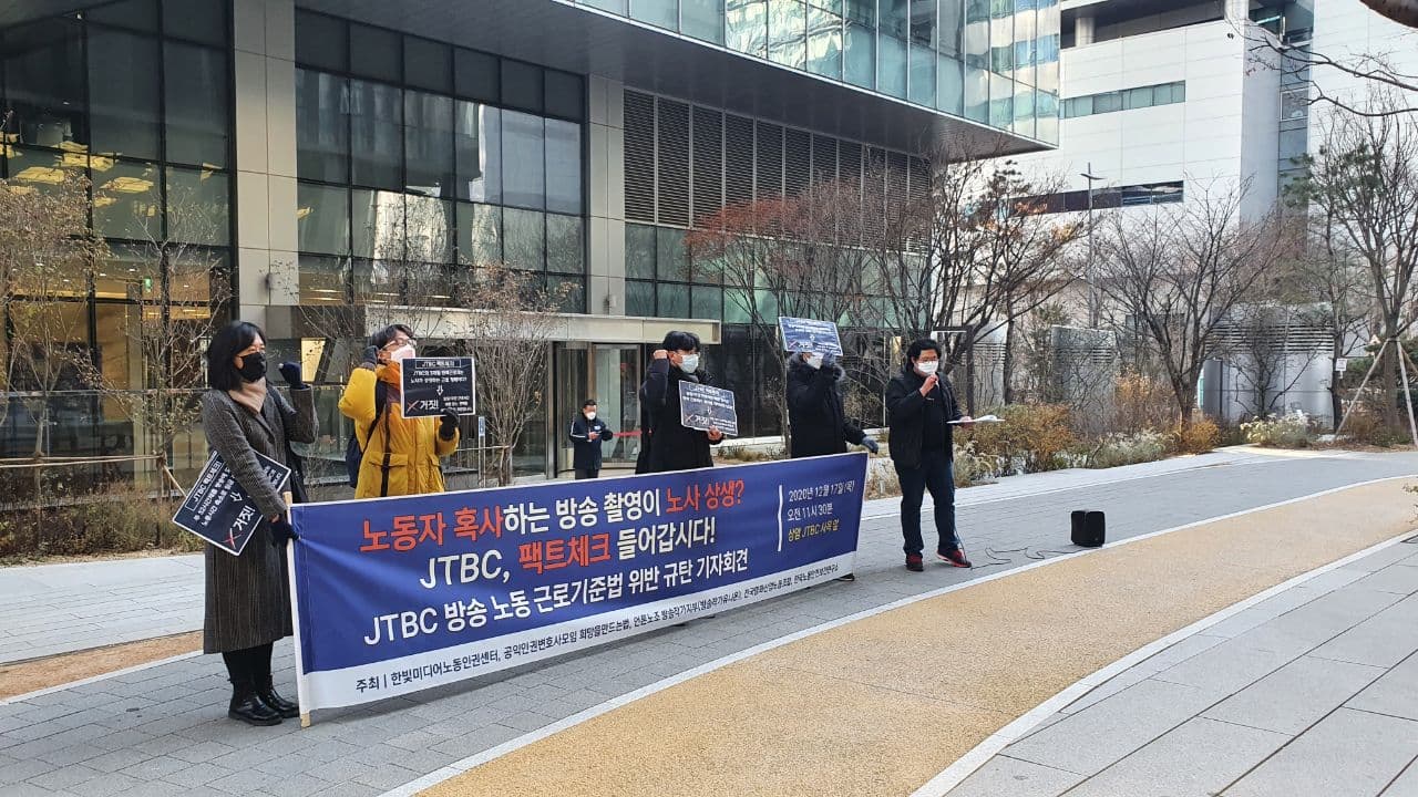 오늘 오전 11시 30분부터 약 1시간 동안 상암 JTBC 사옥 앞에서 한빛미디어노동인권센터와 공익인권변호사모임 희망을만드는법, 방송작가유니온(언론노조 방송작가지부), 전국영화산업노동조합, 한국노동안전보건연구소가 함께 공동으로 JTBC의 '노사 상생'을 가장한 '노동권 탄압'을 규탄하는 기자회견을 진행하였습니다.