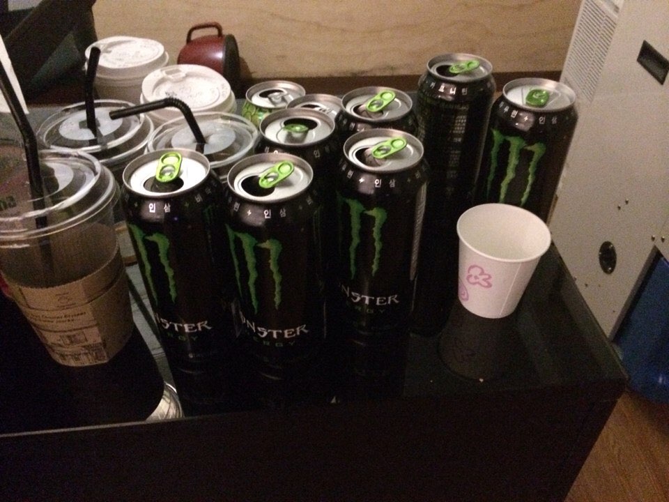 DI(색보정)기사 A : 모 드라마 편집 작업 중 에너지드링크, 커피 캔이 수북이 쌓여 있는 모습니다. 계속 잠이 오는 것을 버티다보니 하루동안 10캔을 마셨다. 이 드라마를 편집할 때 103시간 연속으로 작업을 진행한 적도 있었다.