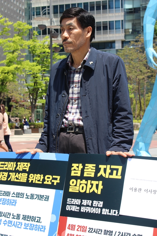 아버지는 “잠 좀 자고 일하자”라고 쓴 피켓을 들고 섰다. 미디어오늘은 이날 1인 시위 직후 이 이사장을 만났다. 이 이사장은 “근로기준법이 개정돼 방송업이 특례업종에서 빠졌다. 노동시간 단축을 준비해야 하지만 여전히 드라마 제작 현장은 변하지 않고 있다”며 “SBS 사례처럼 휴식시간이 지켜지지 않고 있다”고 비판했다.