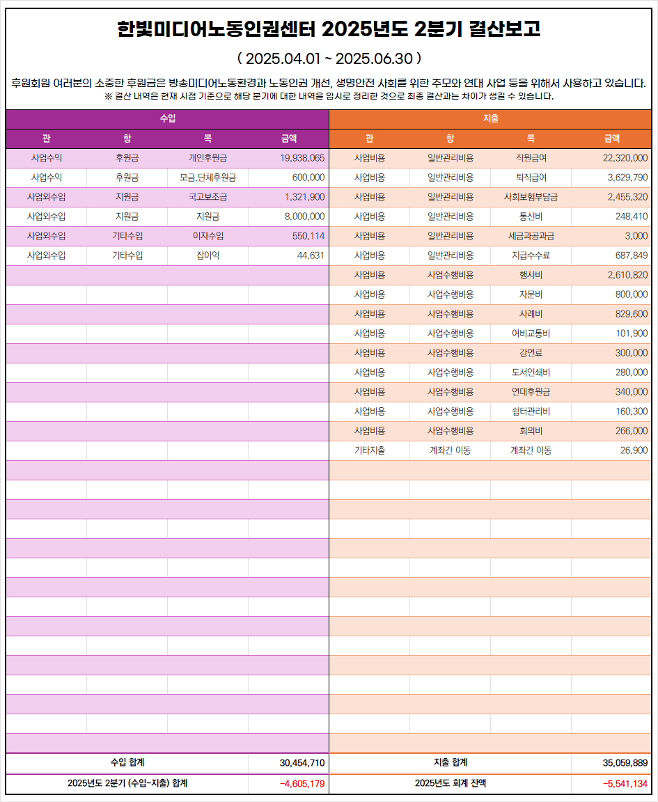 한빛미디어노동인권센터는 후원회원 여러분께서 보내주신 소중한 후원금을 방송미디어 노동환경과 노동인권 개선, 생명안전 사회를 위한 추모와 연대 사업 등을 위해 사용하고 있습니다. 한빛미디어노동인권센터의 2025년 2/4분기 결산 보고를 보내드립니다. |