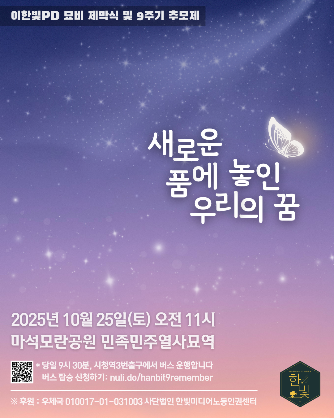 〈이한빛 PD 묘비 제막식 및 9주기 추모제 : 새로운 품에 놓인 우리의 꿈〉 - 일시 : 2025년 10월 25일 (토) 오전 11시 - 장소 : 마석 모락공원 민족민주열사묘지묘역 (경기도 남양주시) * 당일 오전 9시 30분, 시청역 3번출구 앞에서 버스를 운행합니다.