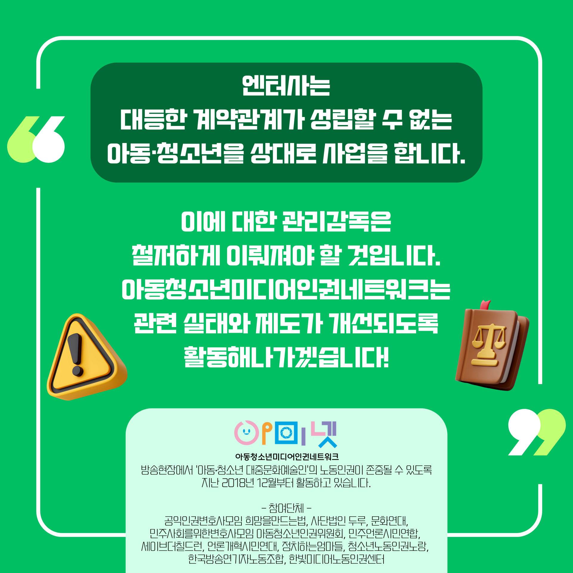 아동청소년미디어인권네트워크는 방송현장에서 ‘아동‧청소년 대중문화예술인’의 노동인권이 존중될 수 있도록 지난 2018년 12월부터 활동하고 있습니다.