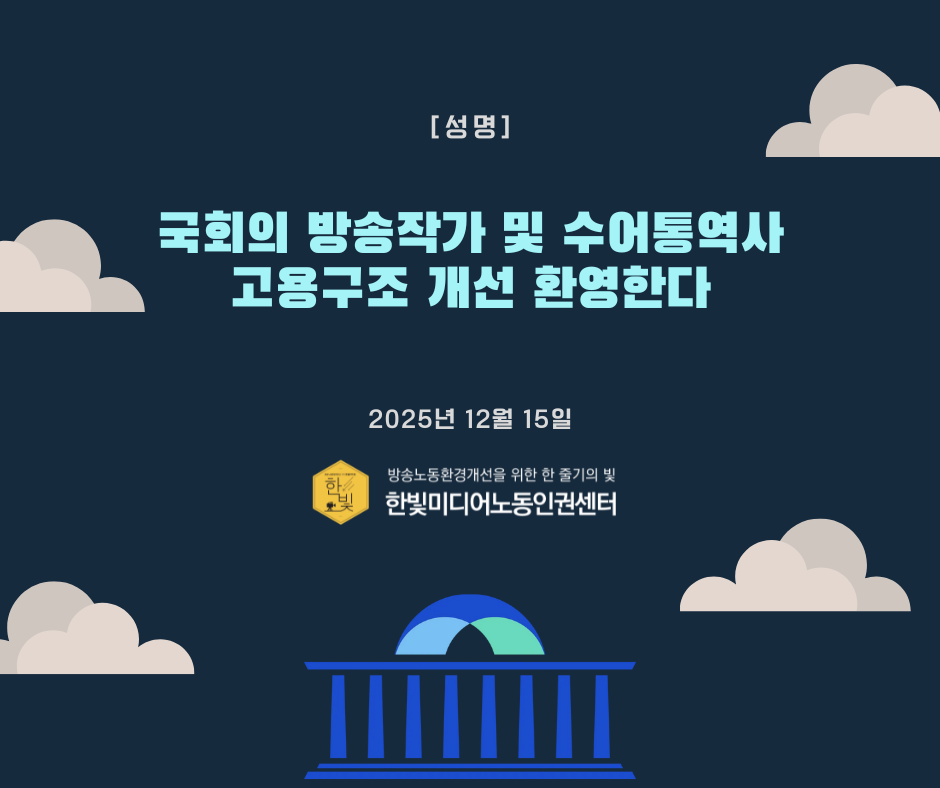 대한민국 국회는 지난 해 12.3 내란사태에서 민주공화국을 구해냈다. 국회의 고용구조 개선을 환영하며, 더 많은 방송노동자들에게 노동의 권리를 구해내는 시작이 되기를 기대한다.